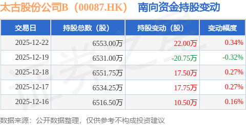 证券之星消息,12月22日南向资金增持22.0万股太古股份公司B(00087.HK)。近5个交易日中,获南向资金增持的有4天,累计净增持47.0万股。近20个交易日中,获南向资金增持的有18天,累计净增持247.25万股。截至目前,南向资金持有太古股份公司B(00087.HK)6553.0万股,占公司已发行普通股的2.29%。