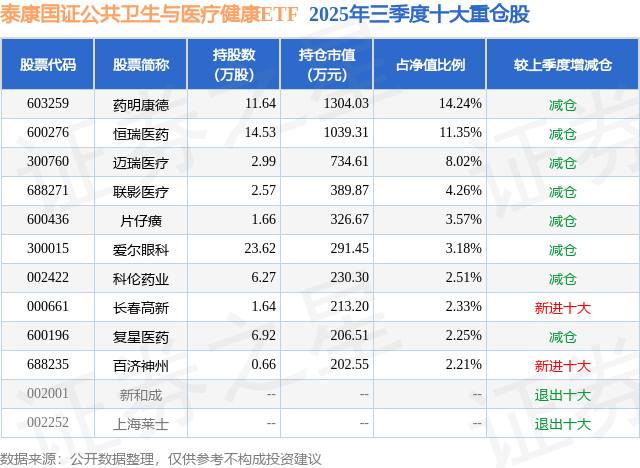 泰康国证公共卫生与医疗健康ETF基金成立于2021年12月6日,基金经理为魏军,基金跟踪标的为国证公共卫生与医疗健康指数,成立以来超额回报为2.93%,近一个月超额回报为-0.03%。最新披露的基金持仓数据显示,截止2025年9月30日,该基金第一大重仓股为药明康德(603259),持股占比为14.24%。