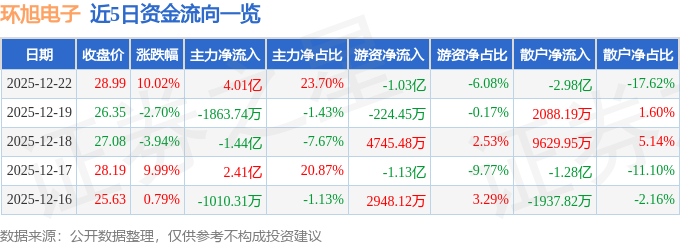 证券之星消息,截至2025年12月22日收盘,环旭电子(601231)报收于28.99元,上涨10.02%,涨停,换手率2.77%,成交量61.47万手,成交额16.93亿元。