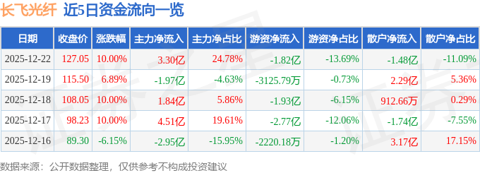 证券之星消息,截至2025年12月22日收盘,长飞光纤(601869)报收于127.05元,上涨10.0%,涨停,换手率2.66%,成交量10.81万手,成交额13.32亿元。