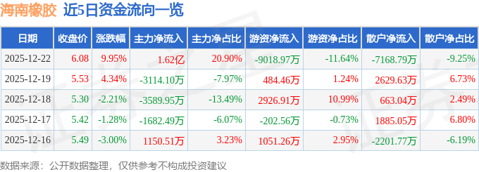 证券之星消息,截至2025年12月22日收盘,海南橡胶(601118)报收于6.08元,上涨9.95%,涨停,换手率3.02%,成交量129.4万手,成交额7.75亿元。