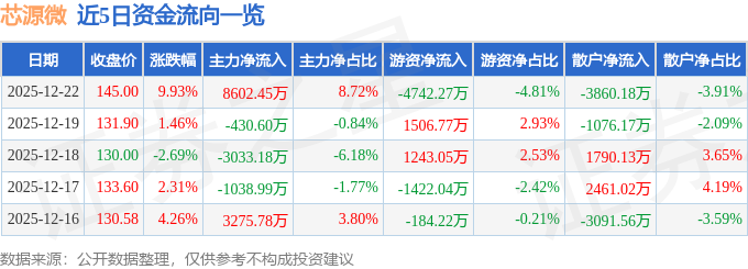证券之星消息,截至2025年12月22日收盘,芯源微(688037)报收于145.0元,上涨9.93%,换手率3.5%,成交量7.06万手,成交额9.87亿元。