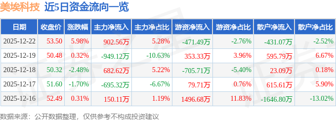 证券之星消息,截至2025年12月22日收盘,美埃科技(688376)报收于53.5元,上涨5.98%,换手率2.37%,成交量3.2万手,成交额1.71亿元。