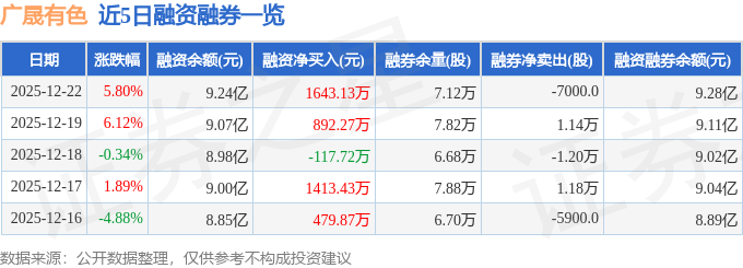 广晟有色融资融券信息显示,融资方面,当日融资买入1.3亿元,融资偿还1.13亿元,融资净买入1643.13万元。融券方面,融券卖出4400.0股,融券偿还1.14万股,融券余量7.12万股,融券余额398.51万元。融资融券余额9.28亿元。