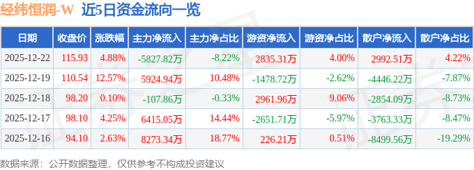 证券之星消息,截至2025年12月22日收盘,经纬恒润(688326)报收于115.93元,上涨4.88%,换手率5.37%,成交量6.0万手,成交额7.09亿元。