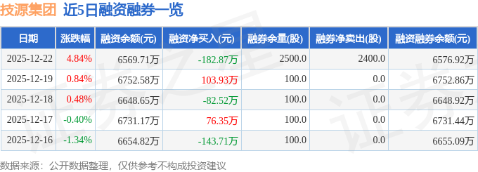 技源集团融资融券信息显示,融资方面,当日融资买入785.04万元,融资偿还967.91万元,融资净偿还182.87万元。融券方面,融券卖出2400.0股,融券偿还0.0股,融券余量2500.0股,融券余额7.21万元。融资融券余额6576.92万元。