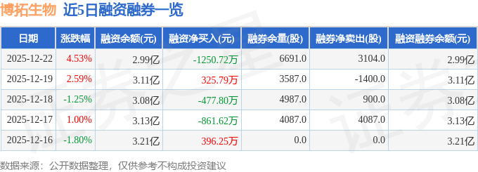 博拓生物融资融券信息显示,融资方面,当日融资买入767.26万元,融资偿还2017.98万元,融资净偿还1250.72万元。融券方面,融券卖出3104.0股,融券偿还0.0股,融券余量6691.0股,融券余额26.56万元。融资融券余额2.99亿元。