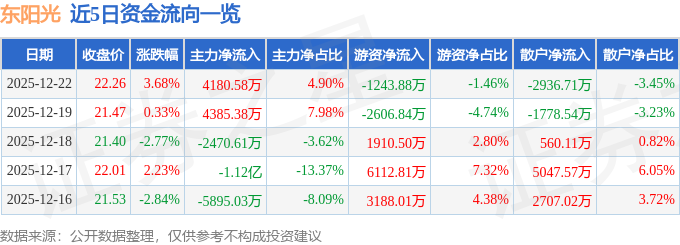 证券之星消息,截至2025年12月22日收盘,东阳光(600673)报收于22.26元,上涨3.68%,换手率1.29%,成交量38.68万手,成交额8.52亿元。