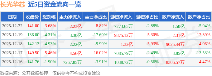 证券之星消息,截至2025年12月22日收盘,长光华芯(688048)报收于141.0元,上涨3.68%,换手率9.92%,成交量17.49万手,成交额25.23亿元。
