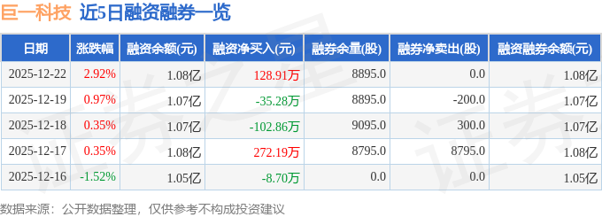 巨一科技融资融券信息显示,融资方面,当日融资买入528.37万元,融资偿还399.46万元,融资净买入128.91万元。融券方面,融券卖出0.0股,融券偿还0.0股,融券余量8895.0股,融券余额26.6万元。融资融券余额1.08亿元。