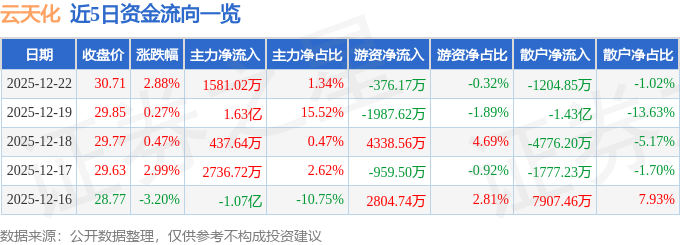 证券之星消息,截至2025年12月22日收盘,云天化(600096)报收于30.71元,上涨2.88%,换手率2.13%,成交量38.76万手,成交额11.82亿元。