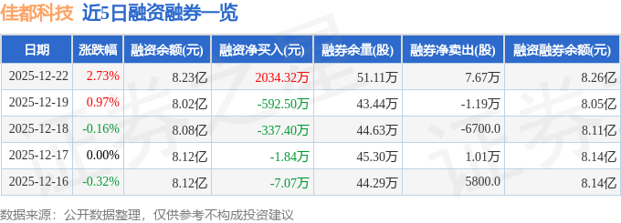佳都科技融资融券信息显示,融资方面,当日融资买入4729.3万元,融资偿还2694.99万元,融资净买入2034.32万元。融券方面,融券卖出10.28万股,融券偿还2.61万股,融券余量51.11万股,融券余额327.1万元。融资融券余额8.26亿元。