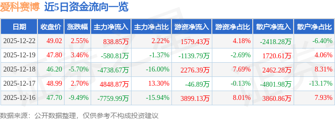 证券之星消息,截至2025年12月22日收盘,爱科赛博(688719)报收于49.02元,上涨2.55%,换手率8.66%,成交量7.77万手,成交额3.78亿元。