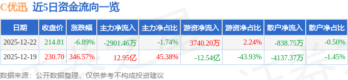证券之星消息,截至2025年12月22日收盘,C优迅(688807)报收于214.81元,下跌6.89%,换手率49.03%,成交量7.37万手,成交额16.68亿元。