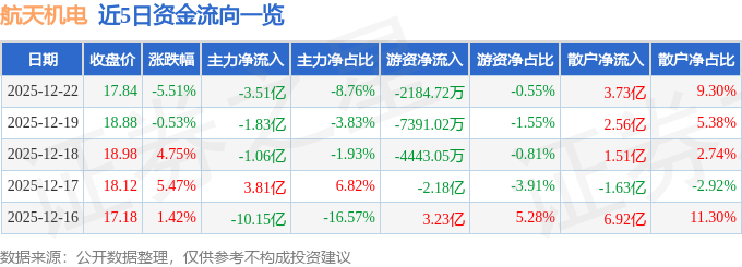 证券之星消息,截至2025年12月22日收盘,航天机电(600151)报收于17.84元,下跌5.51%,换手率15.27%,成交量218.96万手,成交额40.04亿元。