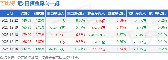 证券之星消息,截至2025年12月22日收盘,吉比特(603444)报收于446.39元,下跌4.2%,换手率4.02%,成交量2.9万手,成交额12.95亿元。