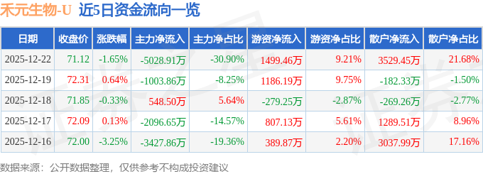 证券之星消息,截至2025年12月22日收盘,禾元生物(688765)报收于71.12元,下跌1.65%,换手率5.57%,成交量2.28万手,成交额1.63亿元。