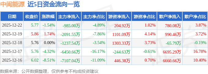 证券之星消息,截至2025年12月22日收盘,中闽能源(600163)报收于5.77元,下跌1.54%,换手率1.84%,成交量34.97万手,成交额2.02亿元。