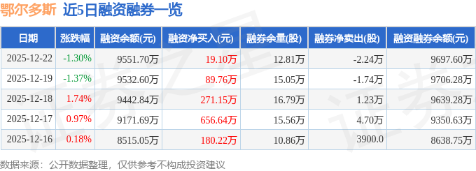 鄂尔多斯融资融券信息显示,融资方面,当日融资买入987.15万元,融资偿还968.05万元,融资净买入19.1万元,连续3日净买入累计380.01万元。融券方面,融券卖出1.54万股,融券偿还3.78万股,融券余量12.81万股,融券余额145.91万元。融资融券余额9697.6万元。
