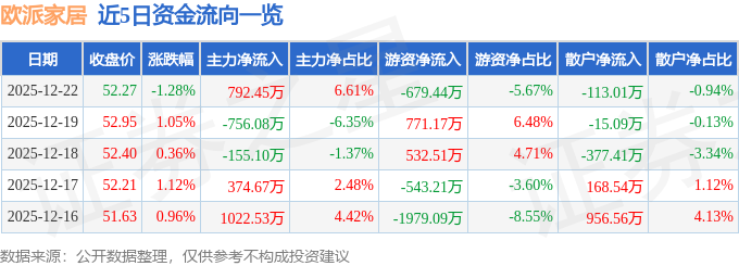 证券之星消息,截至2025年12月22日收盘,欧派家居(603833)报收于52.27元,下跌1.28%,换手率0.38%,成交量2.29万手,成交额1.2亿元。