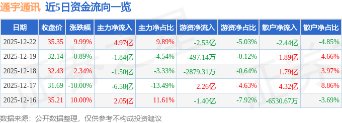 证券之星消息,截至2025年12月22日收盘,通宇通讯(002792)报收于35.35元,上涨9.99%,涨停,换手率44.35%,成交量147.86万手,成交额50.28亿元。