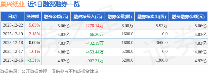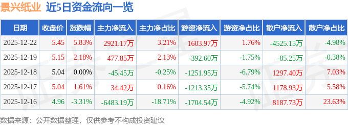 证券之星消息,截至2025年12月22日收盘,景兴纸业(002067)报收于5.45元,上涨5.83%,换手率12.57%,成交量168.18万手,成交额9.09亿元。