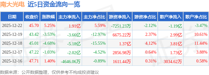 证券之星消息,截至2025年12月22日收盘,南大光电(300346)报收于45.7元,上涨5.25%,换手率11.52%,成交量75.64万手,成交额34.22亿元。