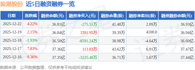 盐湖股份融资融券信息显示,融资方面,当日融资买入4.37亿元,融资偿还4.39亿元,融资净偿还275.51万元。融券方面,融券卖出2.25万股,融券偿还1600.0股,融券余量41.48万股,融券余额1168.49万元。融资融券余额36.93亿元。