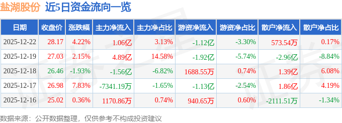 证券之星消息,截至2025年12月22日收盘,盐湖股份(000792)报收于28.17元,上涨4.22%,换手率2.3%,成交量121.56万手,成交额33.99亿元。