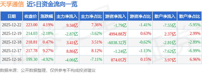 证券之星消息,截至2025年12月22日收盘,天孚通信(300394)报收于223.0元,上涨4.19%,换手率7.41%,成交量57.51万手,成交额127.02亿元。