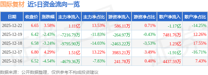 证券之星消息,截至2025年12月22日收盘,国际复材(301526)报收于6.65元,上涨3.58%,换手率8.86%,成交量124.43万手,成交额8.21亿元。
