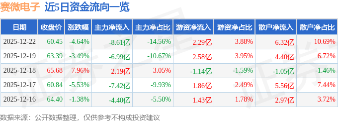 12月22日的资金流向数据方面,主力资金净流出8.61亿元,占总成交额14.56%,游资资金净流入2.29亿元,占总成交额3.88%,散户资金净流入6.32亿元,占总成交额10.69%。