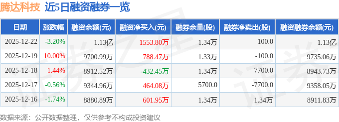 腾达科技融资融券信息显示,融资方面,当日融资买入5364.04万元,融资偿还3810.24万元,融资净买入1553.8万元。融券方面,融券卖出100.0股,融券偿还0.0股,融券余量1.34万股,融券余额33.23万元。融资融券余额1.13亿元。