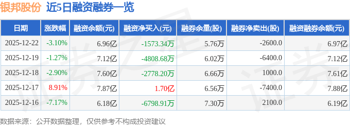 银邦股份融资融券信息显示,融资方面,当日融资买入1.05亿元,融资偿还1.21亿元,融资净偿还1573.34万元。融券方面,融券卖出0.0股,融券偿还2600.0股,融券余量5.76万股,融券余额73.9万元。融资融券余额6.97亿元。