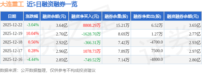 大连重工融资融券信息显示,融资方面,当日融资买入1.63亿元,融资偿还7488.26万元,融资净买入8808.29万元。融券方面,融券卖出6.72万股,融券偿还2000.0股,融券余量15.21万股,融券余额116.36万元。融资融券余额3.65亿元。