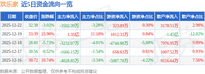 证券之星消息,截至2025年12月22日收盘,欢乐家(300997)报收于32.38元,下跌3.02%,换手率8.45%,成交量32.61万手,成交额10.66亿元。