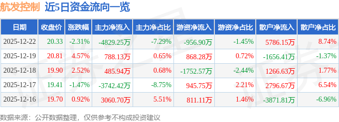 证券之星消息,截至2025年12月22日收盘,航发控制(000738)报收于20.33元,下跌2.31%,换手率2.45%,成交量32.27万手,成交额6.62亿元。