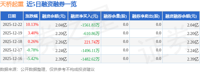 天桥起重融资融券信息显示,融资方面,当日融资买入538.31万元,融资偿还2100.14万元,融资净偿还1561.83万元。融券方面,融券卖出0.0股,融券偿还0.0股,融券余量0.0股,融券余额0.0万元。融资融券余额2.04亿元。
