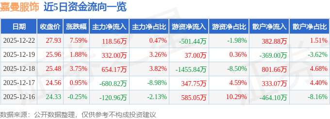证券之星消息,截至2025年12月22日收盘,嘉曼服饰(301276)报收于27.93元,上涨7.59%,换手率19.84%,成交量9.14万手,成交额2.53亿元。