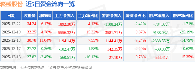 证券之星消息,截至2025年12月22日收盘,崧盛股份(301002)报收于34.24元,上涨6.17%,换手率17.85%,成交量13.3万手,成交额4.58亿元。