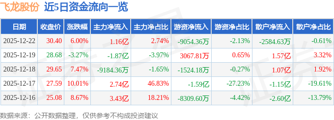 证券之星消息,截至2025年12月22日收盘,飞龙股份(002536)报收于30.4元,上涨6.0%,换手率25.9%,成交量141.0万手,成交额42.44亿元。