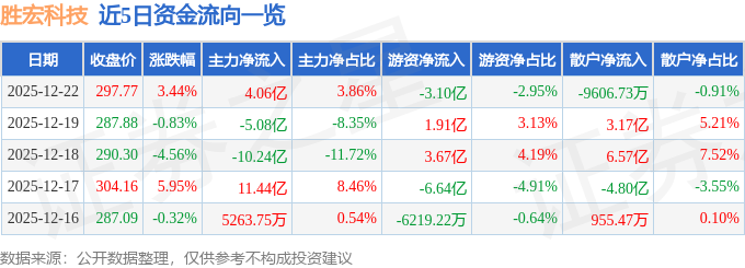 证券之星消息,截至2025年12月22日收盘,胜宏科技(300476)报收于297.77元,上涨3.44%,换手率4.15%,成交量35.46万手,成交额105.23亿元。