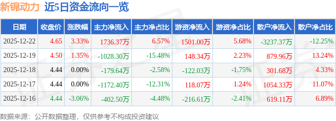证券之星消息,截至2025年12月22日收盘,新锦动力(300157)报收于4.65元,上涨3.33%,换手率7.87%,成交量55.73万手,成交额2.64亿元。