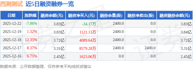 西测测试融资融券信息显示,融资方面,当日融资买入1.81亿元,融资偿还1.82亿元,融资净偿还34.17万元。融券方面,融券卖出0.0股,融券偿还0.0股,融券余量2400.0股,融券余额26.56万元。融资融券余额3.83亿元。