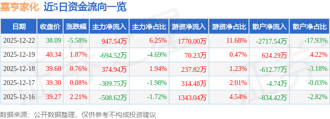 证券之星消息,截至2025年12月22日收盘,嘉亨家化(300955)报收于38.09元,下跌5.58%,换手率3.91%,成交量3.94万手,成交额1.52亿元。