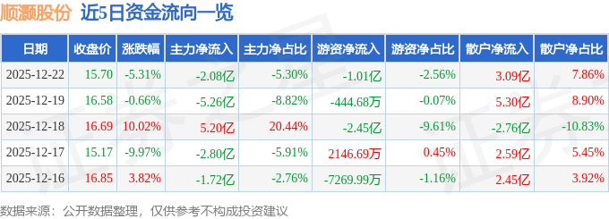 证券之星消息,截至2025年12月22日收盘,顺灏股份(002565)报收于15.7元,下跌5.31%,换手率23.26%,成交量246.51万手,成交额39.29亿元。