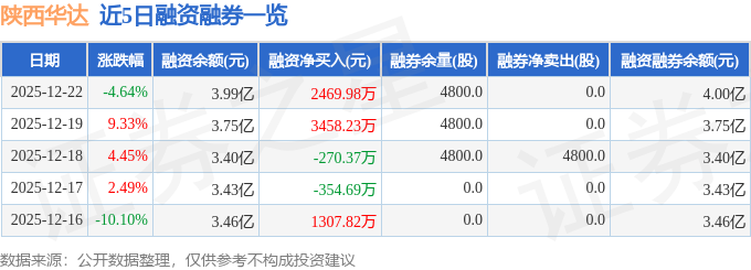 陕西华达融资融券信息显示,融资方面,当日融资买入2.25亿元,融资偿还2.01亿元,融资净买入2469.98万元。融券方面,融券卖出0.0股,融券偿还0.0股,融券余量4800.0股,融券余额32.68万元。融资融券余额4.0亿元。