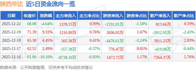 证券之星消息,截至2025年12月22日收盘,陕西华达(301517)报收于68.08元,下跌4.64%,换手率20.25%,成交量19.88万手,成交额13.91亿元。