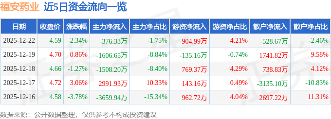 证券之星消息,截至2025年12月22日收盘,福安药业(300194)报收于4.59元,下跌2.34%,换手率4.8%,成交量46.47万手,成交额2.15亿元。