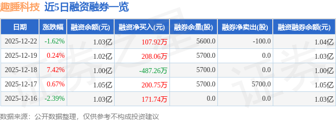 趣睡科技融资融券信息显示,融资方面,当日融资买入673.06万元,融资偿还565.14万元,融资净买入107.92万元。融券方面,融券卖出0.0股,融券偿还100.0股,融券余量5600.0股,融券余额30.21万元。融资融券余额1.04亿元。